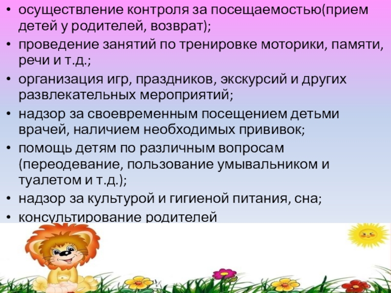 Слайд 3осуществление контроля за посещаемостью(прием детей у родителей, возврат);