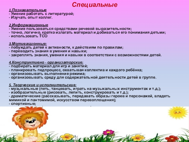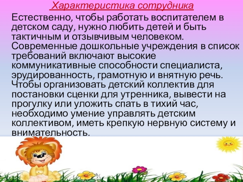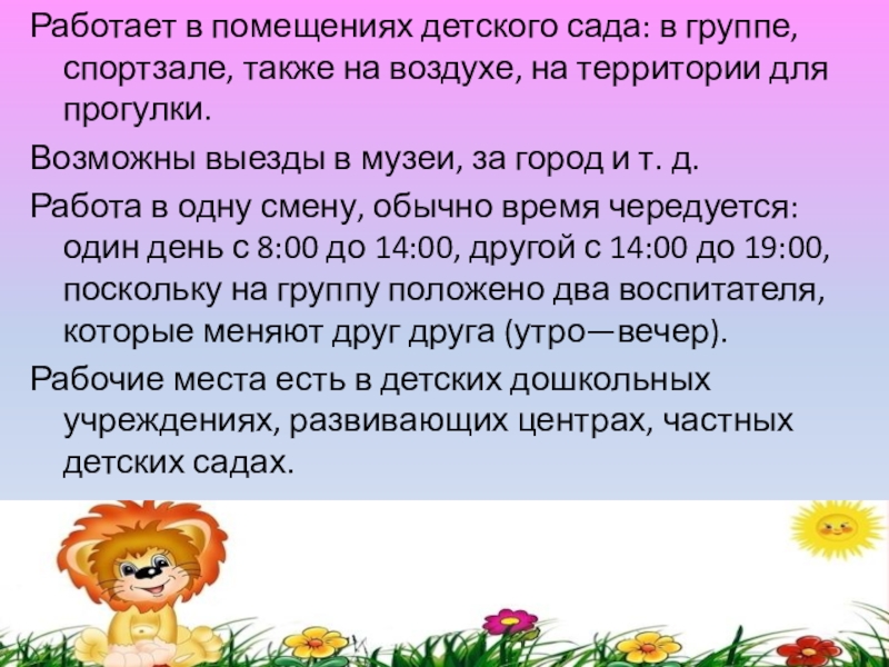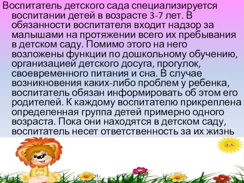 Слайд 10Воспитатель детского сада специализируется воспитании детей в возрасте 3-7 лет. В