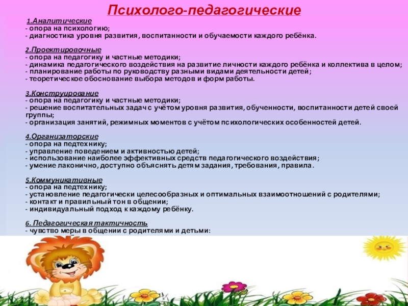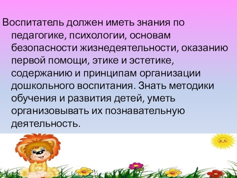 Воспитатель должен иметь знания по педагогике, психологии, основам безопасности жизнедеятельности, оказанию