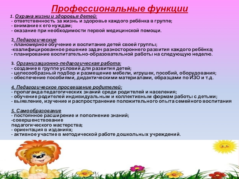 обязанности воспитателя входит надзор за малышами на протяжении всего их пребывания в детском саду. Помимо этого на него возложены функции по дошкольному обучению, организацией детского досуга, прогулок, своевременного питания и сна. В случае возникновения каких-либо проблем у ребенка, воспитатель обязан информировать об этом его родителей. К каждому воспитателю прикреплена определенная группа детей примерно одного возраста. Пока они находятся в детском саду, воспитатель несет ответственность за их жизнь и здоровье.