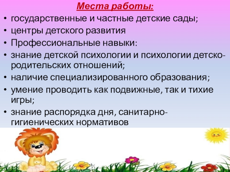 Рабочие места есть в детских дошкольных учреждениях, развивающих центрах, частных детских садах.