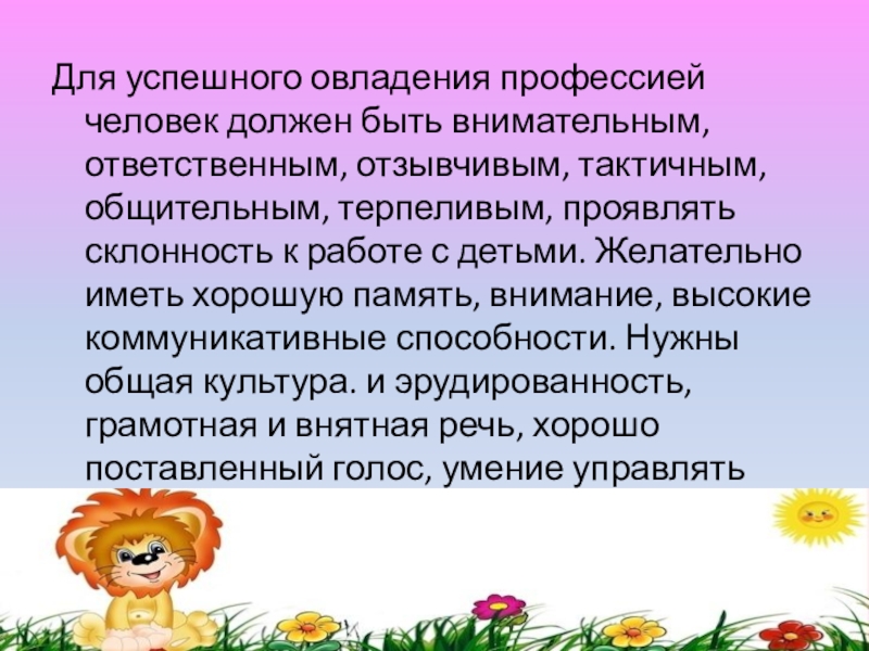 Для успешного овладения профессией человек должен быть внимательным, ответственным, отзывчивым, тактичным,
