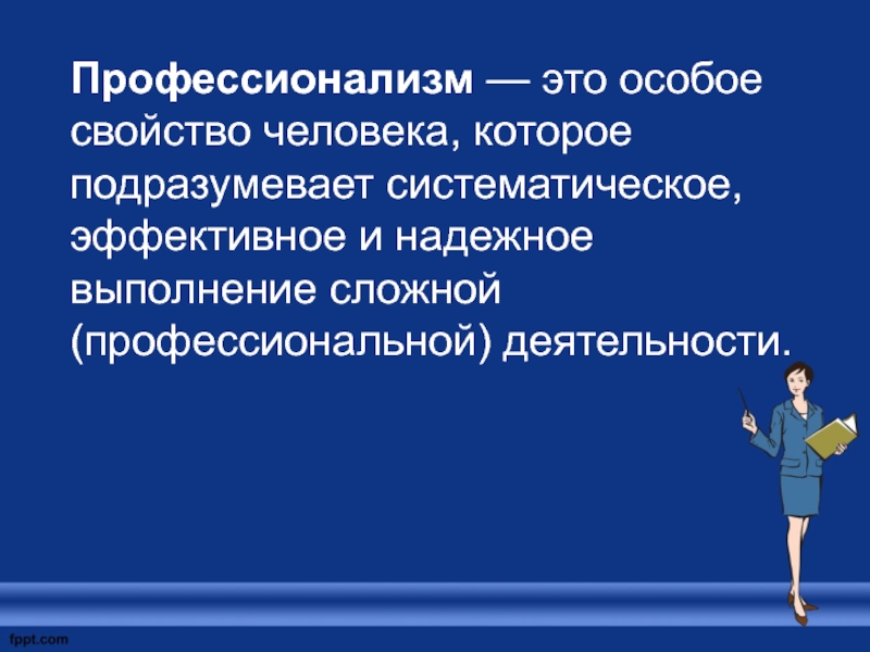 Профессионализм — это особое свойство человека, которое подразумевает систематическое, эффективное и надежное выполнение сложной (профессиональной) деятельности.