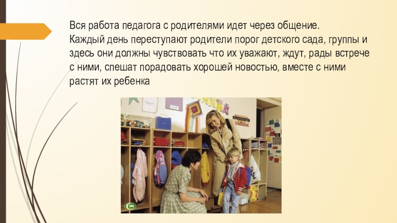 Слайд 9Вся работа педагога с родителями идет через общение.