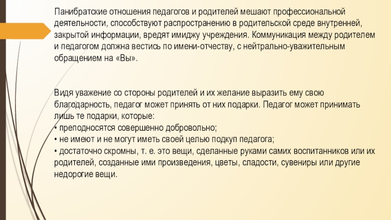 Видя уважение со стороны родителей и их желание выразить ему свою благодарность, педагог может принять от них подарки. Педагог может принимать лишь те подарки, которые: