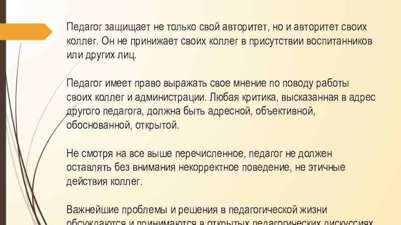 Педагог имеет право выражать свое мнение по поводу работы своих коллег и администрации. Любая критика, высказанная в адрес другого педагога, должна быть адресной, объективной, обоснованной, открытой.