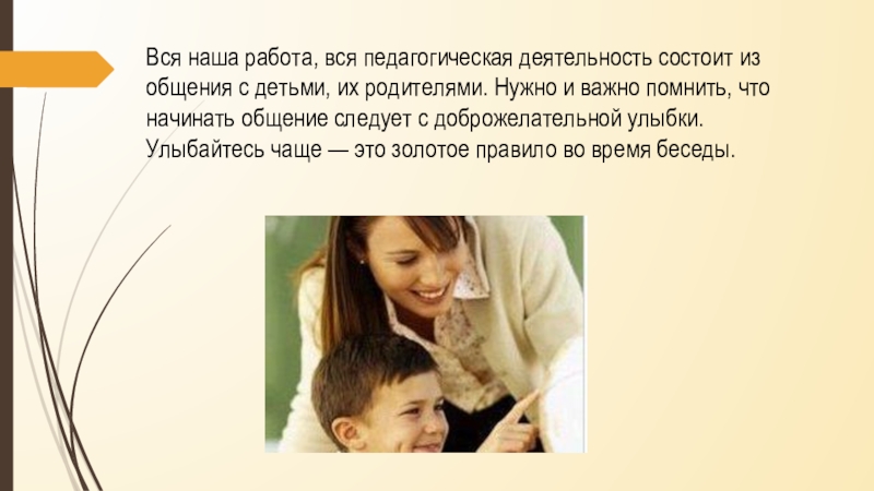 их родителями. Нужно и важно помнить, что начинать общение следует с доброжелательной улыбки. Улыбайтесь чаще — это золотое правило во время беседы.