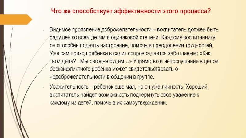 быть радушен ко всем детям в одинаковой степени. Каждому воспитаннику он способен поднять настроение, помочь в преодолении трудностей. Уже сам приход ребенка в садик сопровождается заботливым: «Как твои дела?.. Мы сегодня будем…» Упрямство и непослушание в целом бесконфликтного ребенка может свидетельствовать о недоброжелательности в общении в группе.