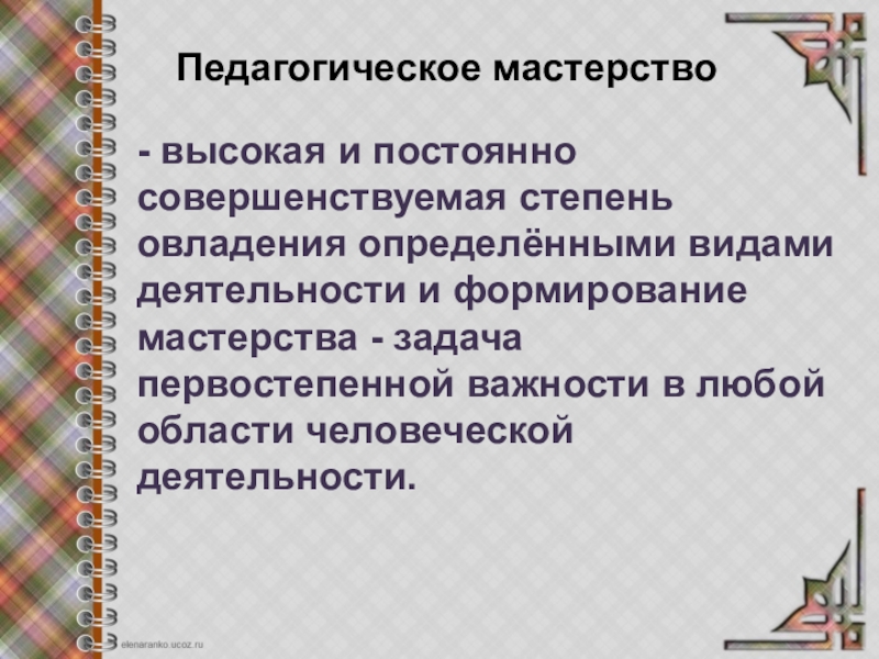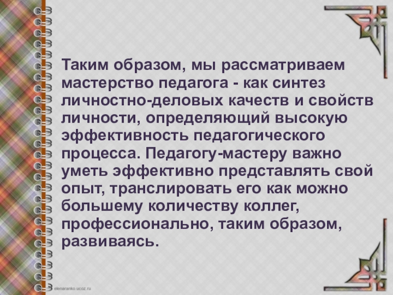 и свойств личности, определяющий высокую эффективность педагогического процесса. Педагогу-мастеру важно уметь эффективно представлять свой опыт, транслировать его как можно большему количеству коллег, профессионально, таким образом, развиваясь.