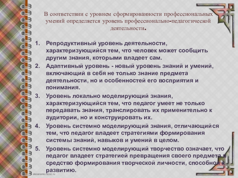 Уровень системно моделирующий творчество означает, что педагог владеет стратегией превращения своего предмета в средство формирования творческой личности, способной к развитию.