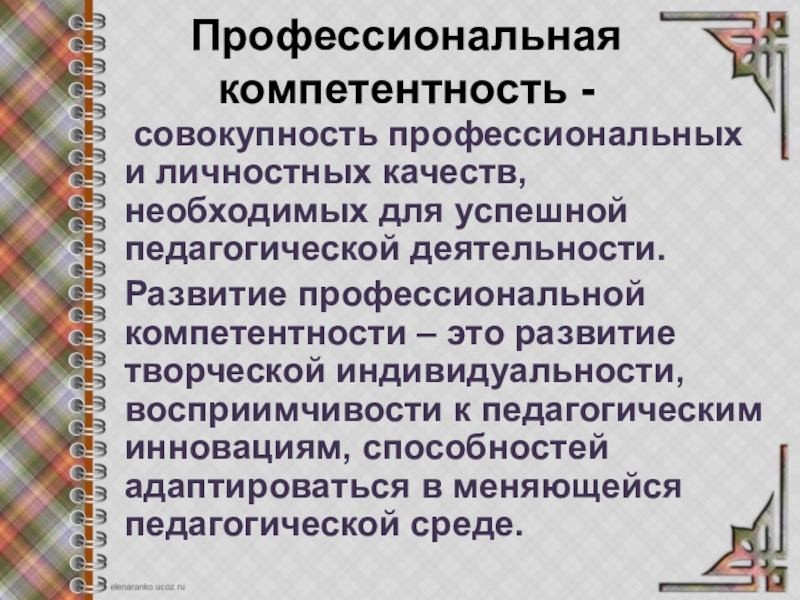 Развитие профессиональной компетентности – это развитие творческой индивидуальности, восприимчивости к педагогическим инновациям, способностей адаптироваться в меняющейся педагогической среде.