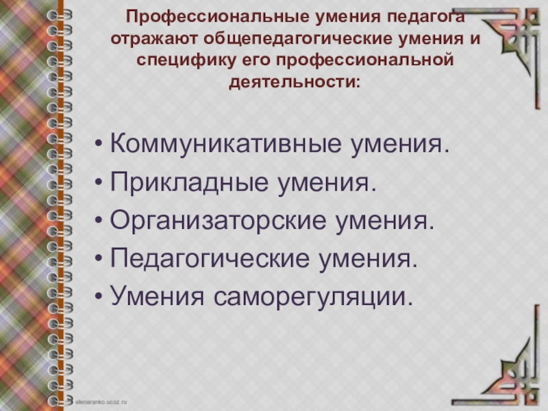 Слайд 5Профессиональные умения педагога отражают общепедагогические умения и специфику его профессиональной деятельности: