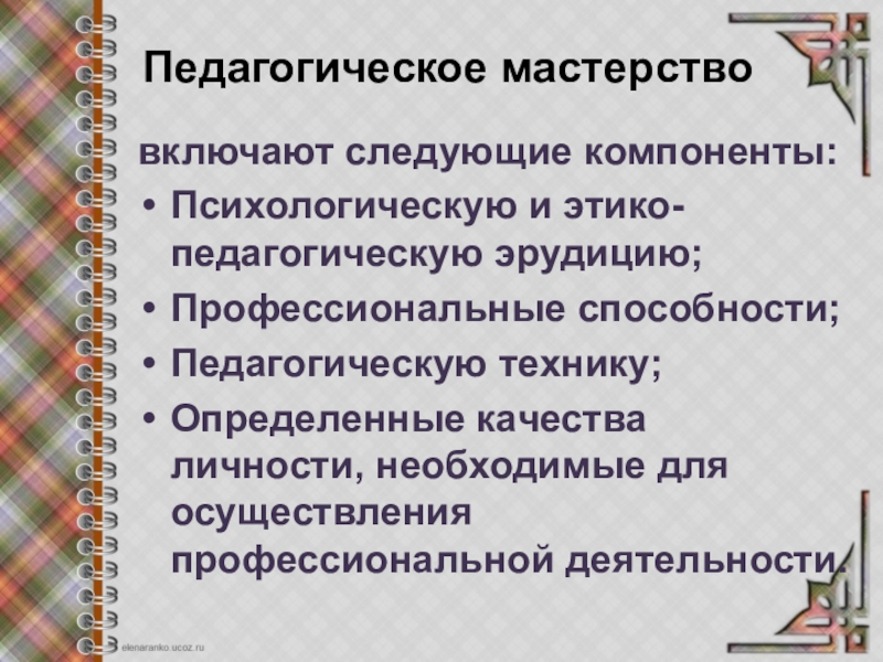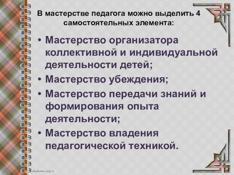 Слайд 12В мастерстве педагога можно выделить 4 самостоятельных элемента: