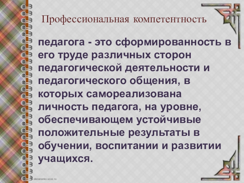 деятельности и педагогического общения, в которых самореализована личность педагога, на уровне, обеспечивающем устойчивые положительные результаты в обучении, воспитании и развитии учащихся.
