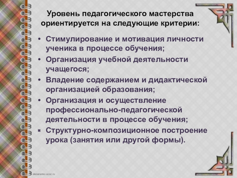 Слайд 13Уровень педагогического мастерства ориентируется на следующие критерии: