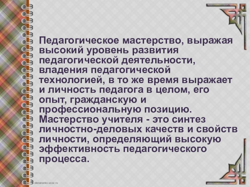 в то же время выражает и личность педагога в целом, его опыт, гражданскую и профессиональную позицию. Мастерство учителя - это синтез личностно-деловых качеств и свойств личности, определяющий высокую эффективность педагогического процесса.