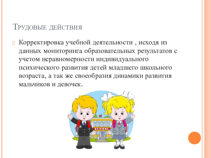 Трудовые действияКорректировка учебной деятельности , исходя из данных мониторинга образовательных результатов с учетом неравномерности индивидуального психического развития