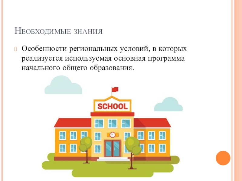 Необходимые знанияОсобенности региональных условий, в которых реализуется используемая основная программа начального общего образования.