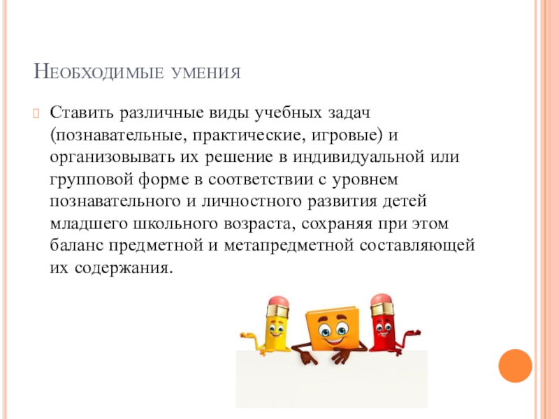 Необходимые уменияСтавить различные виды учебных задач (познавательные, практические, игровые) и организовывать их решение в индивидуальной или групповой