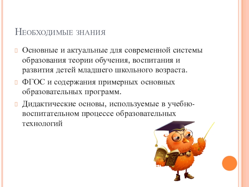 Необходимые знанияОсновные и актуальные для современной системы образования теории обучения, воспитания и развития детей младшего школьного возраста.ФГОС