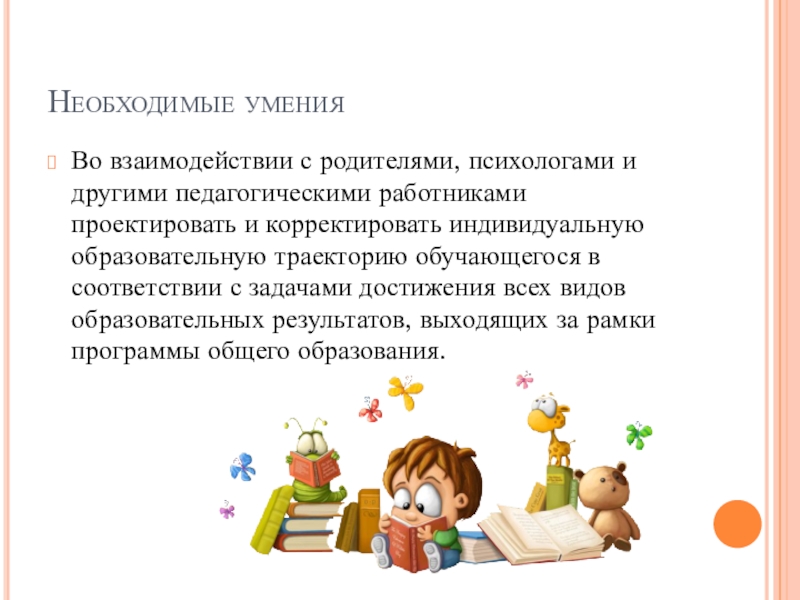 Необходимые уменияВо взаимодействии с родителями, психологами и другими педагогическими работниками проектировать и корректировать индивидуальную образовательную траекторию обучающегося