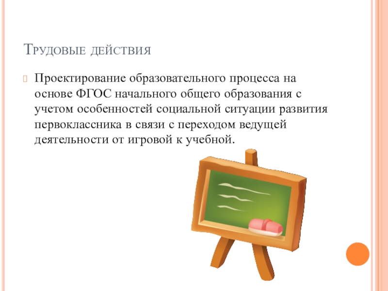 Трудовые действияПроектирование образовательного процесса на основе ФГОС начального общего образования с учетом особенностей социальной ситуации развития первоклассника в связи с переходом ведущей деятельности от игровой к учебной.