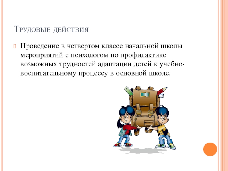 Трудовые действияПроведение в четвертом классе начальной школы мероприятий с психологом по профилактике возможных трудностей адаптации детей к