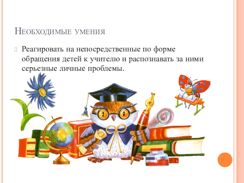 Необходимые уменияРеагировать на непосредственные по форме обращения детей к учителю и распознавать за ними серьезные личные проблемы.