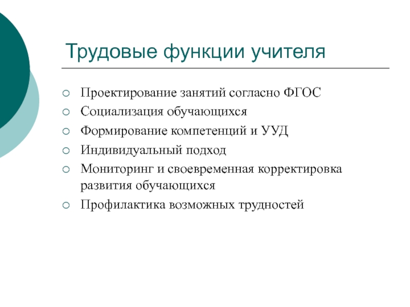 Трудовые функции учителяПроектирование занятий согласно ФГОССоциализация обучающихсяФормирование компетенций и УУДИндивидуальный подходМониторинг и своевременная корректировка развития обучающихсяПрофилактика возможных
