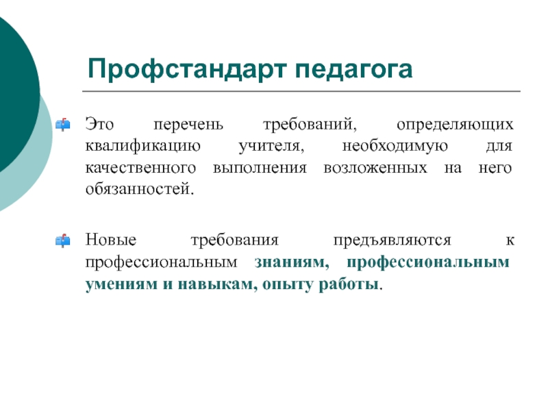 Профстандарт педагогаЭто перечень требований, определяющих квалификацию учителя, необходимую для качественного выполнения возложенных на него обязанностей. Новые требования