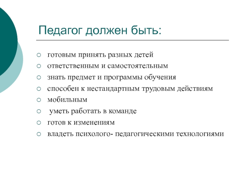Педагог должен быть:готовым принять разных детейответственным и самостоятельнымзнать предмет и программы обученияспособен к нестандартным трудовым действияммобильным уметь