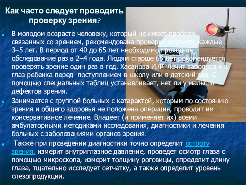 имеет проблем, связанных со зрением, рекомендована проверка окулиста каждые 3–5 лет. В период от 40 до 65 лет необходимо проходить обследование раз в 2–4 года. Людям старше 65 лет рекомендуется проверять зрение один раз в год. Хасанова И.Ф. лечит заболевания глаз ребенка перед поступлением в школу или в детский сад. С помощью специальных таблиц устанавливает, нет ли у малыша дефектов зрения.