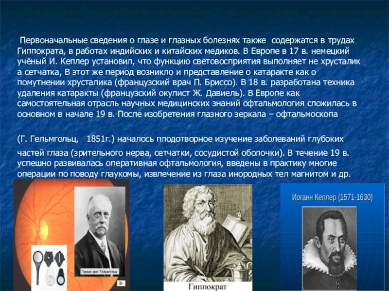 трудах Гиппократа, в работах индийских и китайских медиков. В Европе в 17 в. немецкий учёный И. Кеплер установил, что функцию световосприятия выполняет не хрусталик а сетчатка, В этот же период возникло и представление о катаракте как о помутнении хрусталика (французский врач П. Бриссо). В 18 в. разработана техника удаления катаракты (французский окулист Ж. Давиель). В Европе как самостоятельная отрасль научных медицинских знаний офтальмология сложилась в основном в начале 19 в. После изобретения глазного зеркала – офтальмоскопа