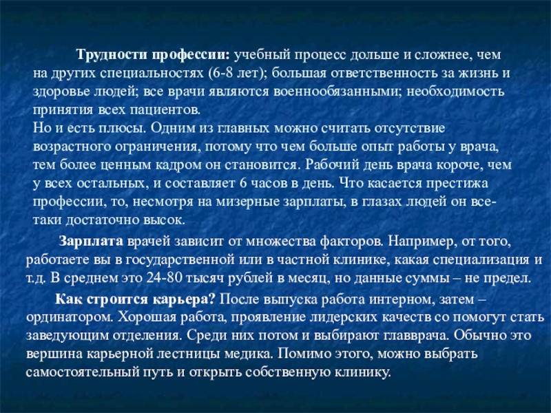 Трудности профессии: учебный процесс дольше и сложнее, чем на других специальностях (6-8 лет); большая ответственность за жизнь и здоровье людей; все врачи являются военнообязанными; необходимость принятия всех пациентов.