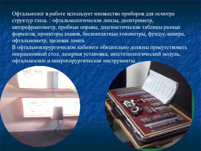 Офтальмолог в работе использует множество приборов для осмотра структур глаза. :