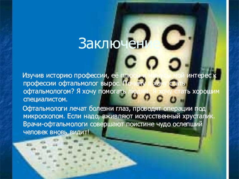 мой интерес к профессии офтальмолог вырос. Почему я хочу стать офтальмологом? Я хочу помогать людям. Я хочу стать хорошим специалистом.