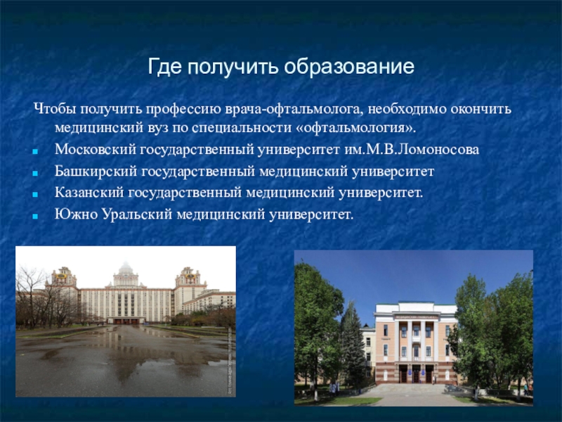 Чтобы получить профессию врача-офтальмолога, необходимо окончить медицинский вуз по