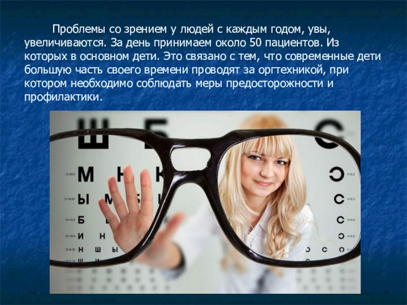 годом, увы, увеличиваются. За день принимаем около 50 пациентов. Из которых в основном дети. Это связано с тем, что современные дети большую часть своего времени проводят за оргтехникой, при котором необходимо соблюдать меры предосторожности и профилактики.