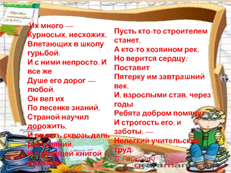 Это сайт презентаций, где можно хранить и обмениваться своими презентациями, докладами, проектами, шаблонами в формате PowerPoint с другими пользователями. Мы помогаем школьникам, студентам, учителям, преподавателям хранить и обмениваться учебными материалами.