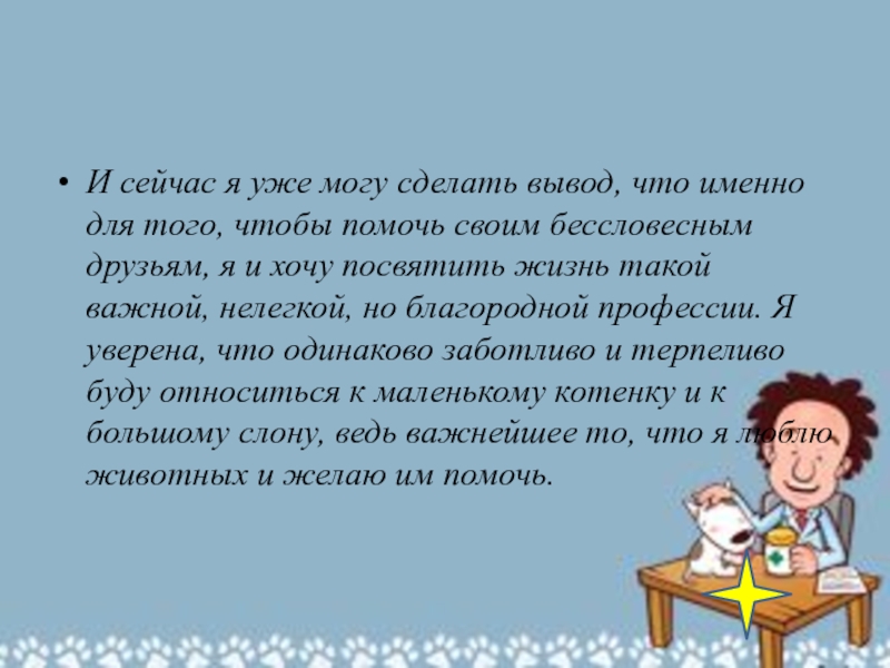 чтобы помочь своим бессловесным друзьям, я и хочу посвятить жизнь такой важной, нелегкой, но благородной профессии. Я уверена, что одинаково заботливо и терпеливо буду относиться к маленькому котенку и к большому слону, ведь важнейшее то, что я люблю животных и желаю им помочь.