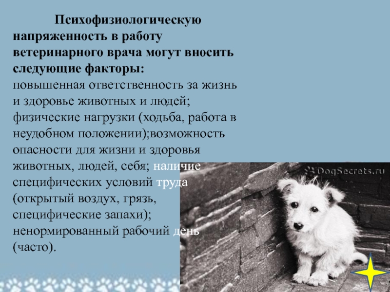 за жизнь и здоровье животных и людей; физические нагрузки (ходьба, работа в неудобном положении);возможность опасности для жизни и здоровья животных, людей, себя; наличие специфических условий труда (открытый воздух, грязь, специфические запахи); ненормированный рабочий день (часто).
