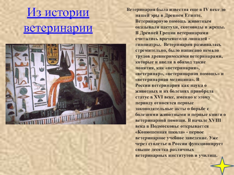 в Древнем Египте. Ветеринарную помощь животным оказывали пастухи, скотоводы и жрецы. В Древней Греции ветеринарами считались врачеватели лошадей - гиппиатры. Ветеринария развивалась стремительно, было написано немало трудов древнеримскими ветеринарами, которые и ввели в обиход такие понятия, как «ветеринария», «ветеринар», «ветеринарная помощь» и «ветеринарная медицина». В России ветеринария как наука о животных и их болезнях приобрела статус в XVI веке, именно к этому периоду относятся первые законодательные акты о борьбе с болезнями животными и первые книги о ветеринарной помощи. В начале XVIII века в Подмосковье открывается «Конюшенная школа» - первое ветеринарное учебное заведение. Уже через столетье в России функционирует свыше десятка различных ветеринарных институтов и училищ.