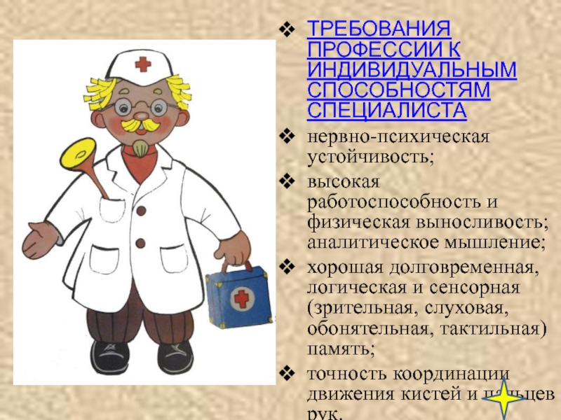 Слайд 9ТРЕБОВАНИЯ ПРОФЕССИИ К ИНДИВИДУАЛЬНЫМ СПОСОБНОСТЯМ СПЕЦИАЛИСТА