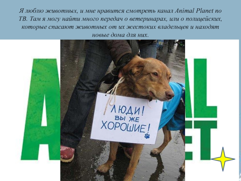 Слайд 5Я люблю животных, и мне нравится смотреть канал Animal Planet по