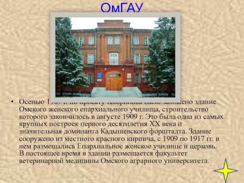 В настоящее время в здании размещается факультет ветеринарной медицины Омского аграрного университета.