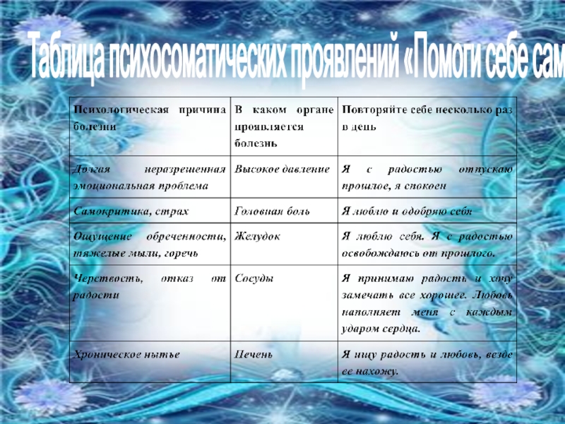 Слайд 9Таблица психосоматических проявлений «Помоги себе сам»
