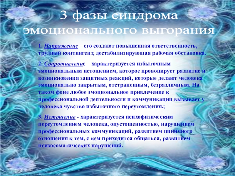 3. Истощение - характеризуется психофизическим переутомлением человека, опустошенностью, нарушением профессиональных коммуникаций, развитием циничного отношения к тем, с кем приходится общаться, развитием психосоматических нарушений.