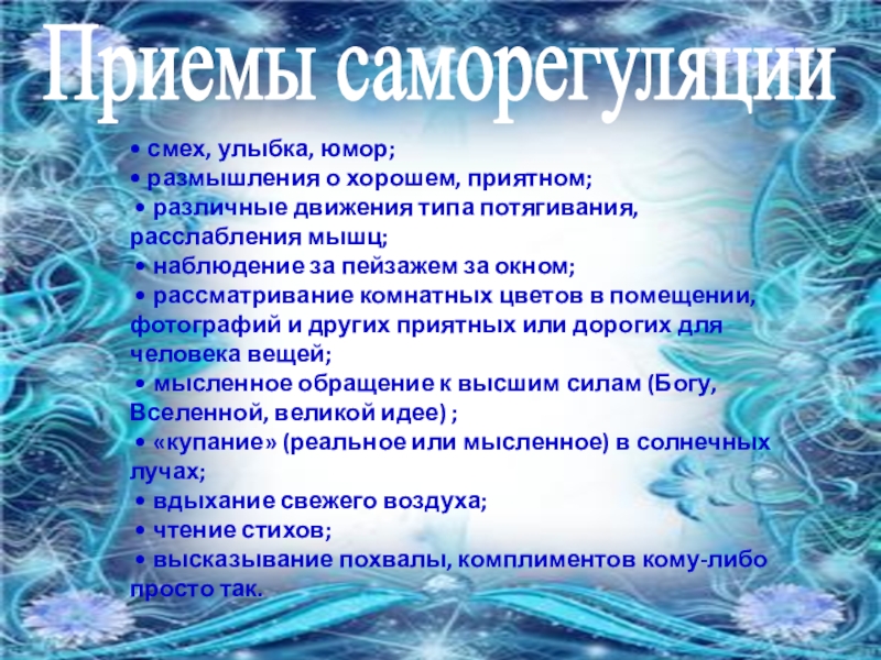 • рассматривание комнатных цветов в помещении, фотографий и других приятных или дорогих для человека вещей;