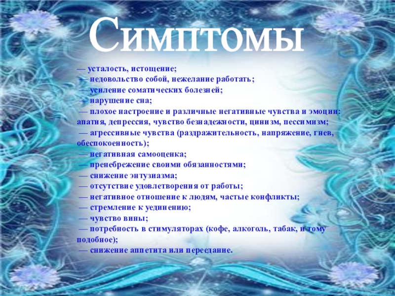 — плохое настроение и различные негативные чувства и эмоции: апатия, депрессия, чувство безнадежности, цинизм, пессимизм;