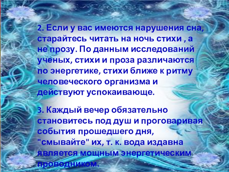 стихи , а не прозу. По данным исследований ученых, стихи и проза различаются по энергетике, стихи ближе к ритму человеческого организма и действуют успокаивающе.